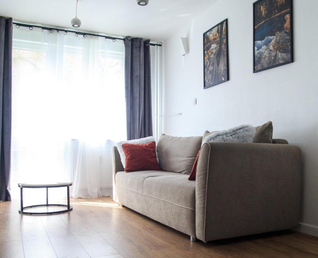 Ciesz się pełną wygodą w naszym apartamencie! W pełni wyposażony aneks kuchenny pozwoli Ci przygotować ulubione dania, a wygodna rozkładana sofa zapewni Ci regenerujący sen.